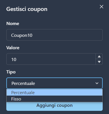 Un Coupon è un codice usufruibile dai clienti per ricevere uno sconto sul prezzo totale del carrello.