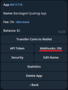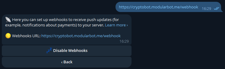 Inviamo quindi l'URL del server di Modular: https://cryptobot.modularbot.me/webhook