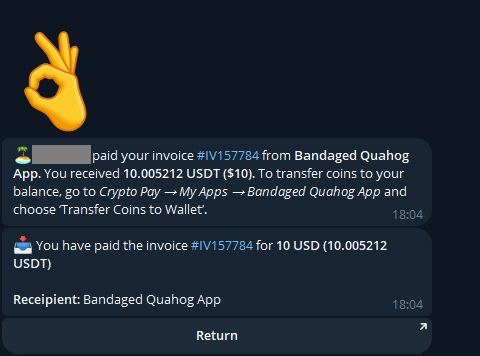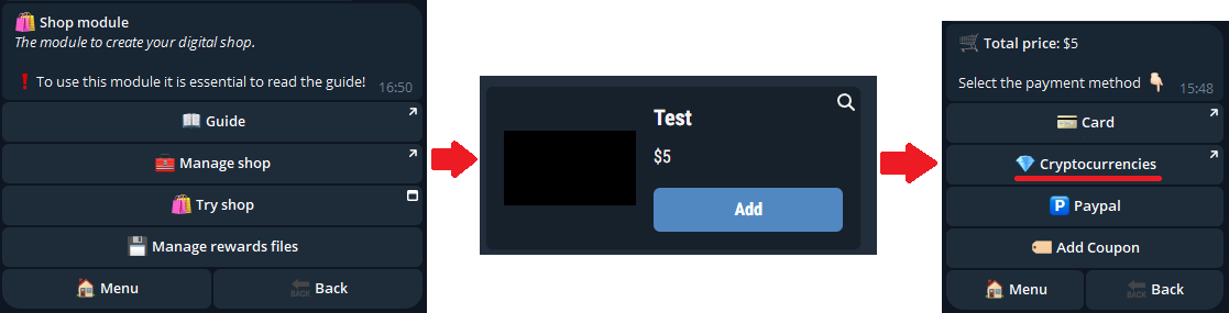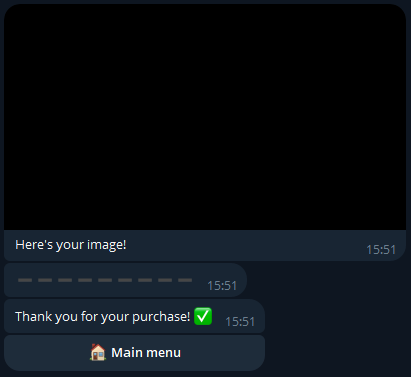 Una volta pagato il bot Crypto ci confermerà il pagamento mentre il nostro bot ci invierà la ricompensa del prodotto appena comprato!