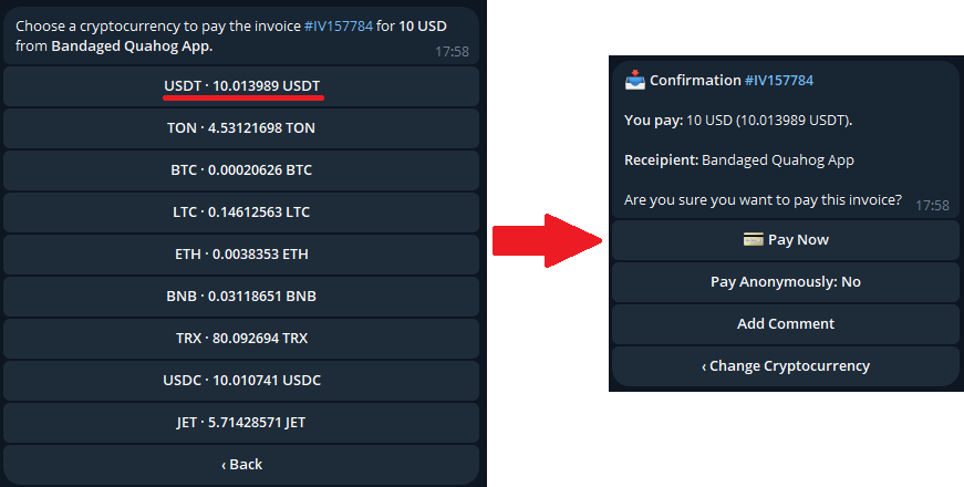 A questo punto verremo reindirizzati al bot Crypto, nel quale ci viene chiesto con cosa pagare; selezioniamo la Criptovaluta aggiunta precedentemente e premiamo su "Pay Now":