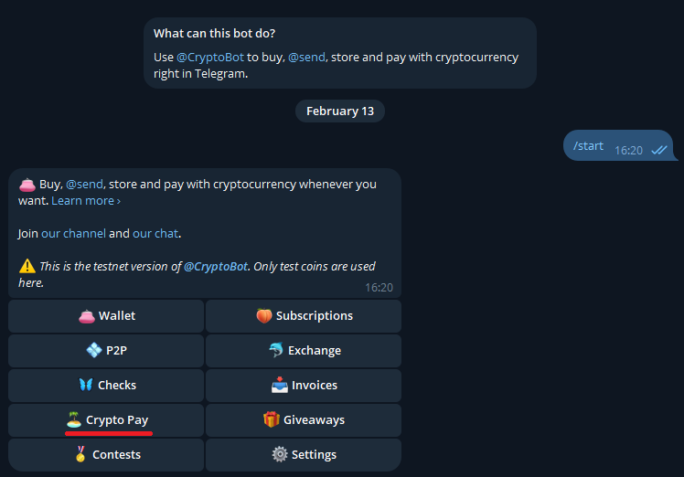 Per configurare il pagamento con crypto occorre innanzitutto avviare il bot con il quale verrranno gestite le transazioni. Avviamo quindi il bot di test @CryptoTestnetBot: