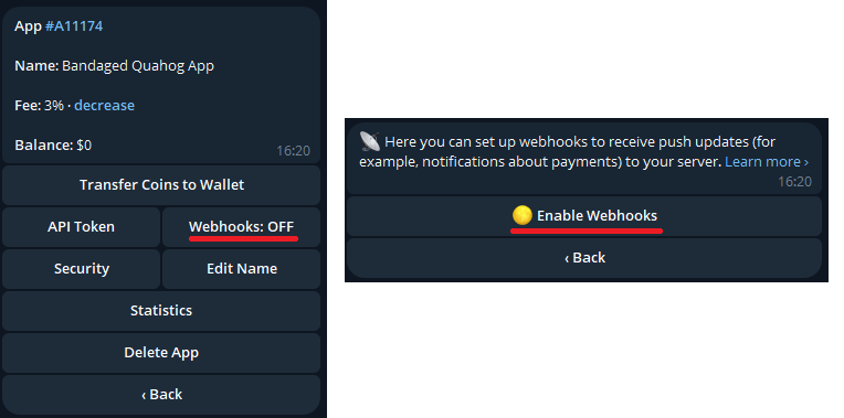 Infine premiamo su Webhooks e poi su Enable Webhook:
