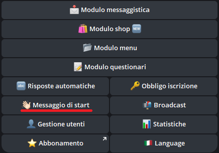 Dopo aver premuto su "Messaggio di start" nel menu di configurazioni del nostro bot, premiamo su "Bottoni":