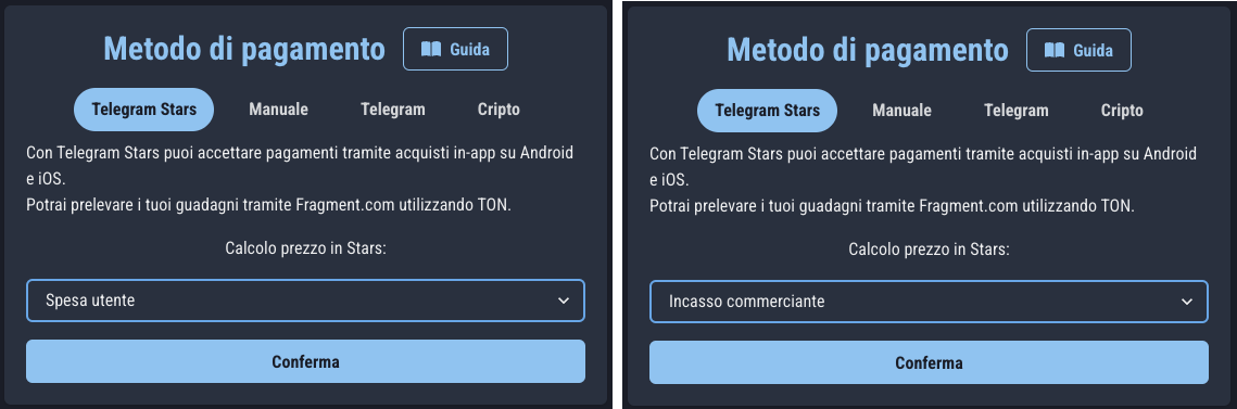 要设置使用两种模式中的哪一种,请打开商店管理后台并点击导航栏中的 设置。在“支付方式”部分,你会找到以“Telegram Stars”为单位的价格计算设置: