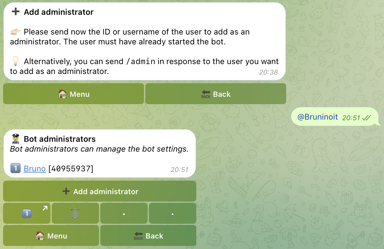 要将用户提升为机器人管理员,你(机器人所有者)可以在回复该用户消息时使用 /admin。要移除某个用户,你可以使用 /unandmin。