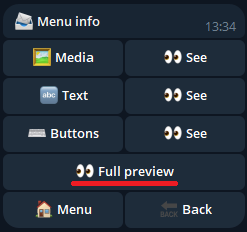 从菜单的配置中,info我们在菜单中插入了一个 Gif、一段文本和一个按钮。插入的按钮是一个额外的菜单按钮,因此将允许用户访问子菜单 more-info。