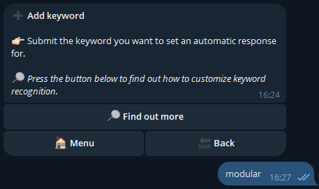 现在我们已经发送了单词“modular”,可以决定当机器人在用户消息中识别到我们的关键词时将执行什么操作: