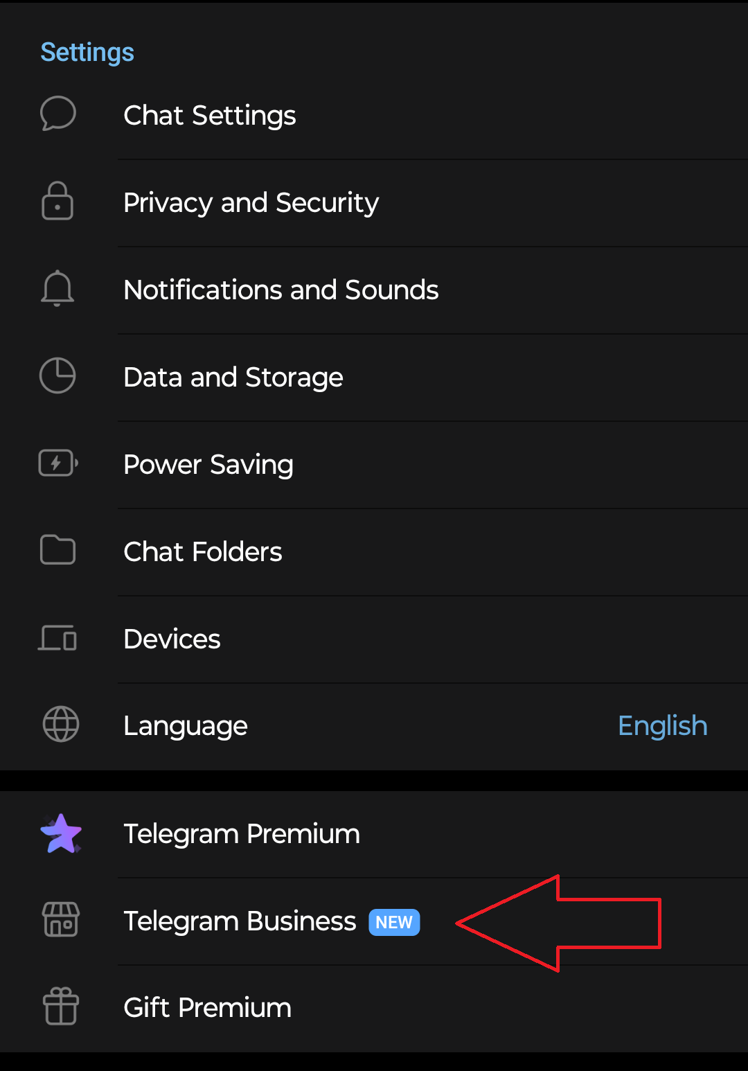 现在你需要前往你的“Telegram Business”套件,从 Telegram 的设置面板进入: