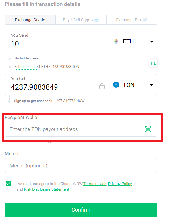 我们建议使用 ChangeNow,这是一个无需任何个人信息即可在不同加密货币之间交换的兑换平台,收取低费用。