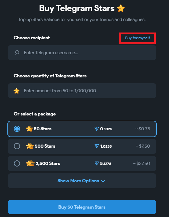 购买 Telegram Stars 仅限使用 TON,但有一些系统可以轻松将 USDT、BTC 或 NOTCOIN 转换为 TON。